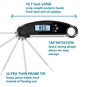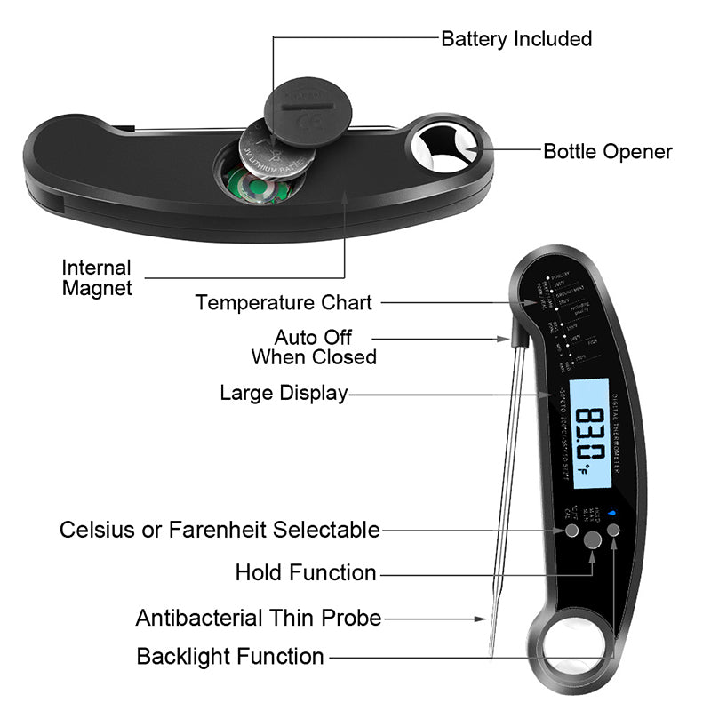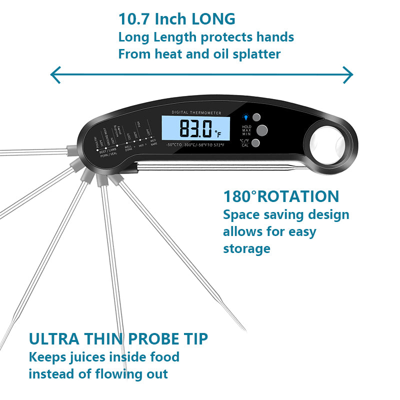 The large LCD warm backlit screen makes this digital meat thermometer easy to read temperatures in dim light and bright outdoor environments.