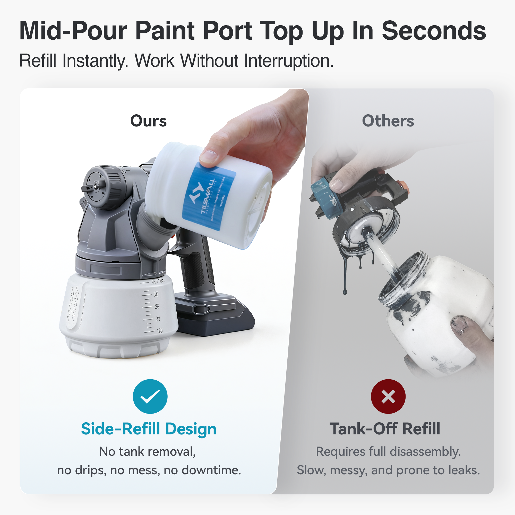 Our innovative side-feed design revolutionizes refills. You can now add paint quickly and cleanly from the side without unscrewing the entire container, maximizing efficiency and minimizing mess.