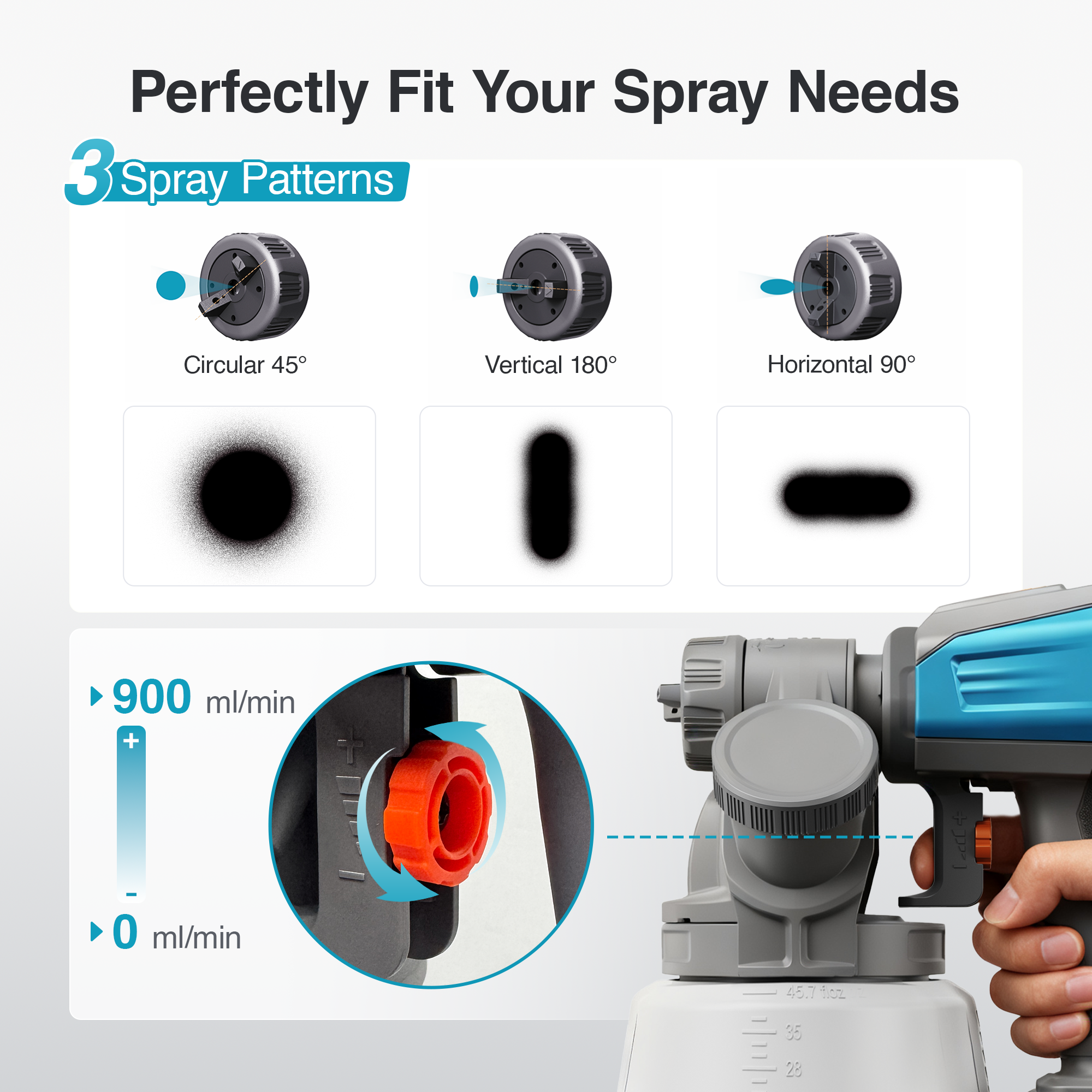 Achieve professional, customized results on any project. This spray paint gun offers three spray patterns (horizontal, vertical, circular) and a variable flow control (0-900 ml/min) to perfectly adapt to your task, from fine furniture finishing to broad wall coverage.