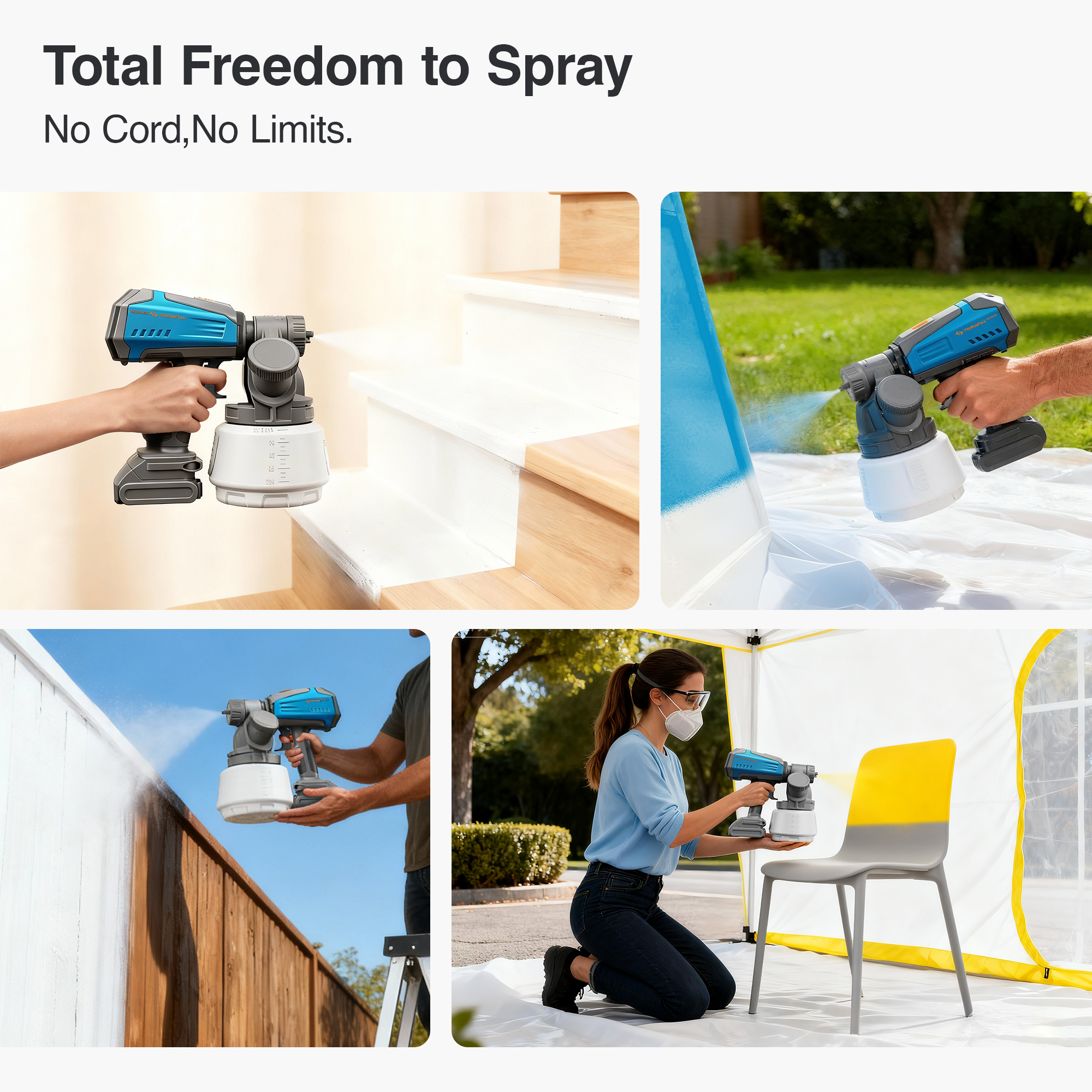 Enjoy complete freedom of movement with this cordless paint sprayer. Powered by compatible Makita 20V batteries (Battery Not Included), it is ideal for a wide range of indoor and outdoor projects like house painting, walls, fences, furniture, cabinets, doors, garage, and anywhere power outlets are out of reach.
